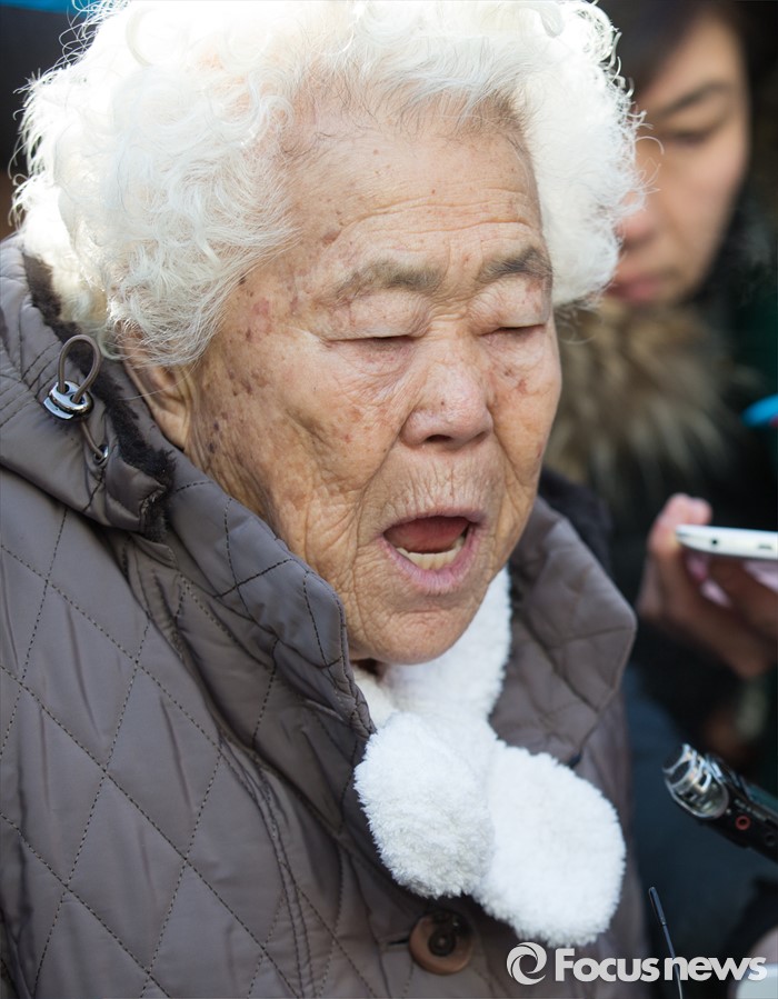 (서울=포커스뉴스) 책 '제국의 위안부'를 써 일본군 위안부 피해자들의 명예를 훼손했다는 혐의로 재판을 받게 된 박유하 세종대 국제학부 교수에 대한 공판이 열린 20일 오전 서울 광진구 동부지방법원에서 공판이 끝난 뒤 위안부 피해자 이옥선 할머니가 취재진의 질문에 답변하고 있다.