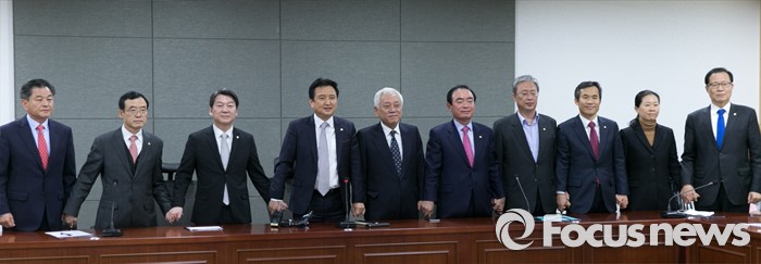 (서울=포커스뉴스) 20일 오전 서울 여의도 국회 의원회관에서 열린 국민의당 소속 의원단 회의에 참석한 의원들이 손을 잡고 취재진을 향해 포즈를 취하고 있다. 왼쪽부터 신학용, 임내현, 안철수, 김영환, 김한길, 장병완, 유성엽, 김승남, 권은희, 문병호 의원.