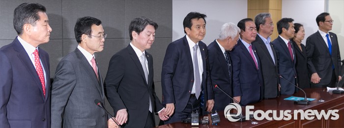(서울=포커스뉴스) 20일 오전 서울 여의도 국회 의원회관에서 열린 국민의당 소속 의원단 회의에 참석한 의원들이 손을 잡고 취재진을 향해 포즈를 취하고 있다. 왼쪽부터 신학용, 임내현, 안철수, 김영환, 김한길, 장병완, 유성엽, 김승남, 권은희, 문병호 의원.