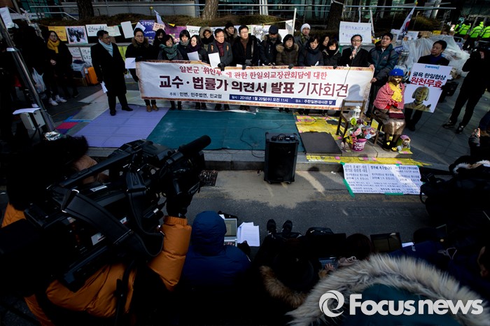 (서울=포커스뉴스) 20일 오전 서울 종로구 일본대사관 인근에서 민주사회를 위한 변호사모임 관계자들이 일본군 위안부 문제 관련 한일외교장관회담에 대한 교수, 법률가 의견서 발표 기자회견을 하고 있다.