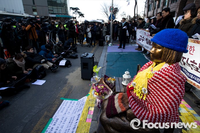 (서울=포커스뉴스) 20일 오전 서울 종로구 일본대사관 인근에서 민주사회를 위한 변호사모임 관계자들이 일본군 위안부 문제 관련 한일외교장관회담에 대한 교수, 법률가 의견서 발표 기자회견을 하고 있다.