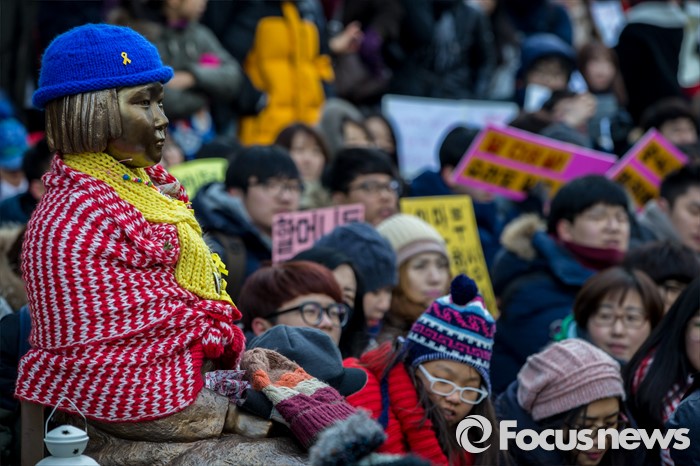 (서울=포커스뉴스) 20일 오후 서울 종로구 옛 일본대사관 앞에서 열린 제1214차 일본군 위안부 문제 해결 위한 정기수요시위에서 참가자들이 한일 위안부 합의 무효를 촉구 하고 있다. 이날 일본군 위안부 피해자 할머니들은 연이은 혹한으로 시위에 자리하지 못했다.