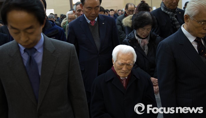 (서울=포커스뉴스)20일 오전 서울 동작구 김영삼대통령 기념도서관에서 열린 민주동지회 신년인사모임에서 최형우 전 내무장관이 김영삼 대통령을 기리는 묵념을 하고 있다.