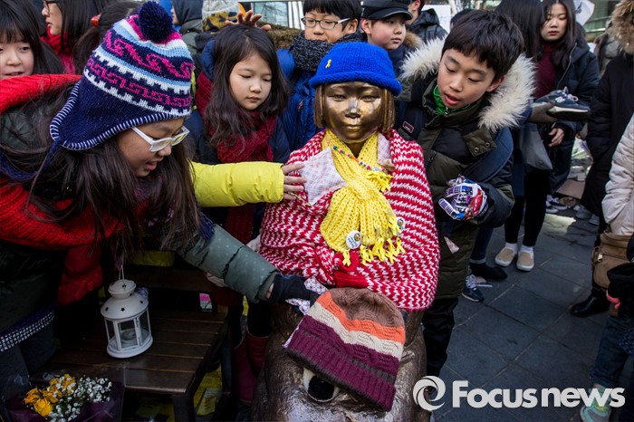 (서울=포커스뉴스) 20일 오후 서울 종로구 옛 일본대사관 앞에서 열린 제1214차 일본군 위안부 문제 해결 위한 정기수요시위에 참가한 어린이들이 소녀상에 보온용품을 올려 놓고 있다. 이날 일본군 위안부 피해자 할머니들은 연이은 혹한으로 시위에 자리하지 못했다.