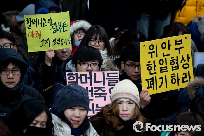 (서울=포커스뉴스) 20일 오후 서울 종로구 옛 일본대사관 앞에서 열린 제1214차 일본군 위안부 문제 해결 위한 정기수요시위에서 참가자들이 한일 위안부 합의 무효를 촉구 하고 있다. 이날 일본군 위안부 피해자 할머니들은 연이은 혹한으로 시위에 자리하지 못했다.
