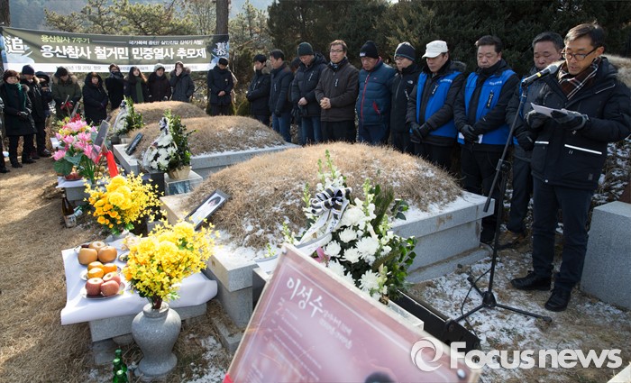 (남양주=포커스뉴스) 20일 오후 경기도 남양주시 모란공원묘지에서 열린 '용산참사 7주기 철거민 민중열사 추모제'에서 당시에 같이 망루에서 활동했던 생존자 및 관계자들이 발언을 하고 있다.
