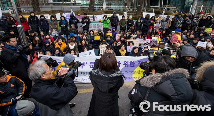 (서울=포커스뉴스) 20일 오후 서울 종로구 옛 일본대사관 앞에서 열린 제1214차 일본군 위안부 문제 해결 위한 정기수요시위에서 참가자들이 한일 위안부 합의 무효를 촉구 하고 있다. 이날 일본군 위안부 피해자 할머니들은 연이은 혹한으로 시위에 자리하지 못했다.