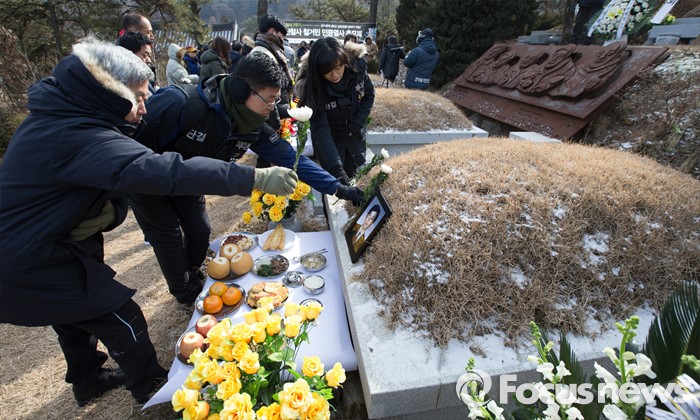 (남양주=포커스뉴스) 20일 오후 경기도 남양주시 모란공원묘지에서 열린 '용산참사 7주기 철거민 민중열사 추모제'에서 용산참사7주기 추모위원회를 비롯한 유족들이 헌화를 하고 있다.