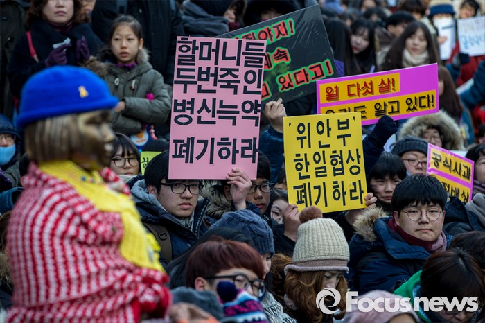 (서울=포커스뉴스) 20일 오후 서울 종로구 옛 일본대사관 앞에서 열린 제1214차 일본군 위안부 문제 해결 위한 정기수요시위에서 참가자들이 한일 위안부 합의 무효를 촉구 하고 있다. 이날 일본군 위안부 피해자 할머니들은 연이은 혹한으로 시위에 자리하지 못했다.