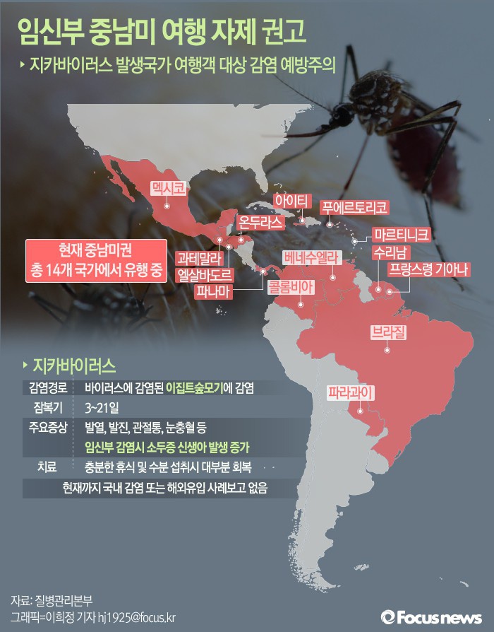 (서울=포커스뉴스) 보건복지부와 질병관리본부는 20일 중남미 지역에서 지카바이러스(Zika virus) 감염증이 지속해서 유행하고 있어 여행 자제를 권고했다. 특히 임신부가 지카바이러스에 감염될 경우 소두증(小頭症) 신생아의 출산 가능성이 제기되고 있어 중남미 여행을 출산 이후로 연기할 것을 권고하였다.