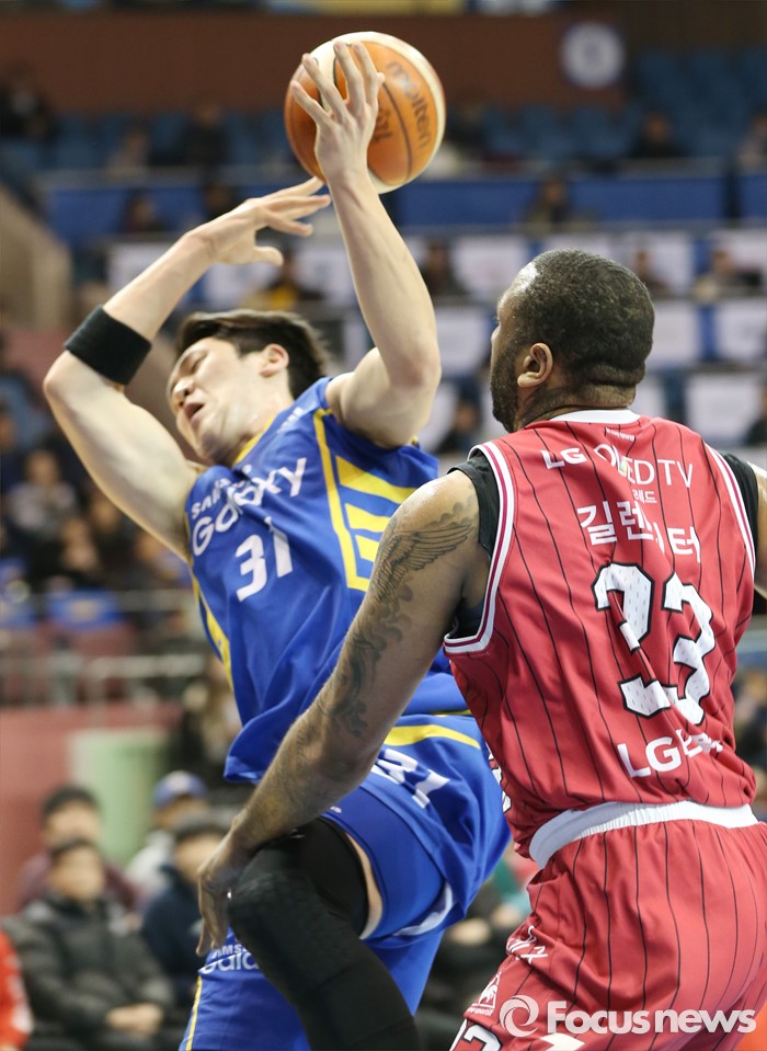 (서울=포커스뉴스) 20일 서울 잠실실내체육관에서 열린 2015-2016 프로농구 삼성-LG 경기에서 삼성 김준일이 슈팅 동작에서 LG 길렌워터에게 파울을 당하고 있다.