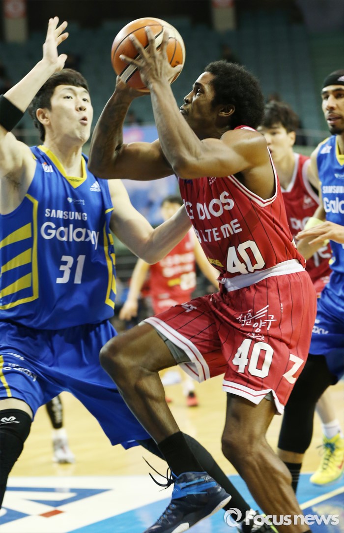 (서울=포커스뉴스) 20일 서울 잠실실내체육관에서 열린 2015-2016 프로농구 삼성-LG 경기에서 LG 샤크가 삼성 김준일의 수비를 앞에 두고 슈팅을 노리고 있다.