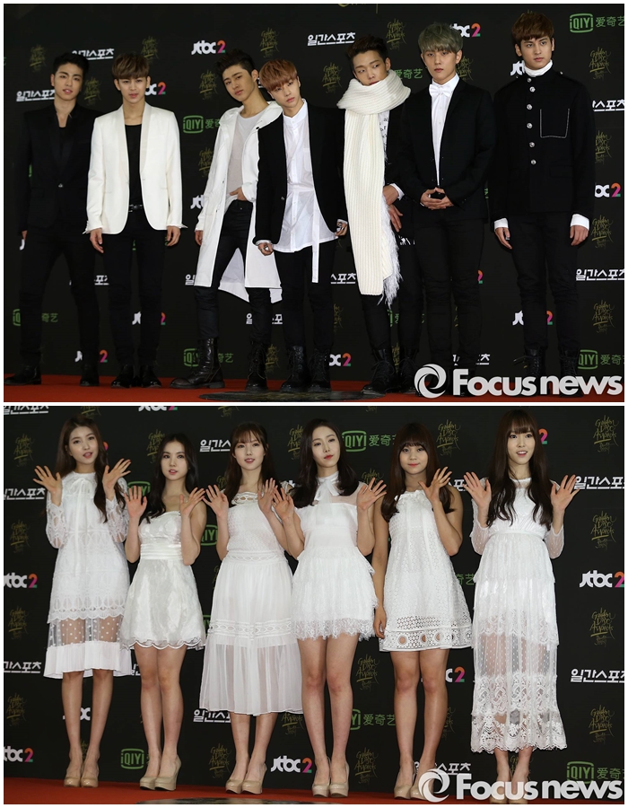 ‘골든디스크’는 음원과 음반 판매량을 기준으로 지난 한해(2014년 11월~2015년 11월 집계 기간) 동안 가장 사랑 받은 대중음악과 가수를 선정하는 시상식이다. 20일과 21일 양일에 걸쳐 디지털 음원 대상과 음반 대상으로 나뉘어 시상한다.(서울=포커스뉴스) 20일 서울 동대문구 경희대학교 평화의 전당에서 열린 제 30회 골든디스크 시상식에 참석한 보이그룹 아이콘(위)과 걸그룹 여자친구가 포토타임을 갖고 있다. 2016.01.20 김유근 기자