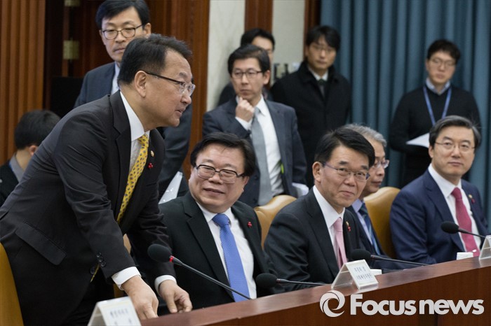 (서울=포커스뉴스) 유일호 경제부총리 겸 기획재정부 장관이 21일 오전 서울 종로구 정부서울청사에서 열린 경제관계장관회의에 참석하기 위해 입장해 주요 장관들과 인사하고 있다.