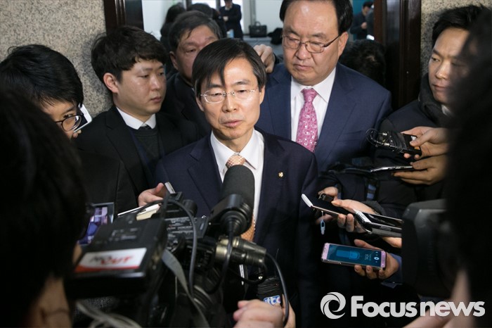 (서울=포커스뉴스) 더불어민주당을 탈당한 조경태 의원이 21일 오전 서울 여의도 국회에서 열린 새누리당 최고위원회의에 참석해 입당원서를 제출한 뒤 기자질문에 답변하고 있다.