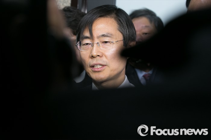 (서울=포커스뉴스) 더불어민주당을 탈당한 조경태 의원이 21일 오전 서울 여의도 국회에서 열린 새누리당 최고위원회의에 참석해 입당원서를 제출한 뒤 기자질문에 답변하고 있다.