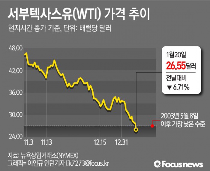 (서울=포커스뉴스) 20일(현지시간) 뉴욕상업거래소(NYMEX)에서 서부텍사스산 원유(WTI)는 전날대비 1.91달러(6.71%) 떨어진 배럴당 26.55달러로 2003년 5월 이후 최저치를 기록했다.