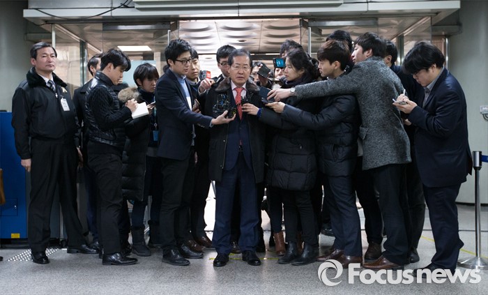 (서울=포커스뉴스) 고 성완종 전 경남기업 회장에게서 불법정치자금 1억원을 받은 혐의로 기소된 홍준표 경남지사가 21일 오전 첫 공판에 출석하기 위해 서울중앙지방법원으로 들어서며 취재진 질문에 답하고 있다.