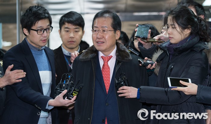 (서울=포커스뉴스) 고 성완종 전 경남기업 회장에게서 불법정치자금 1억원을 받은 혐의로 기소된 홍준표 경남지사가 21일 오전 첫 공판에 출석하기 위해 서울중앙지방법원으로 들어서며 취재진 질문에 답하고 있다.
