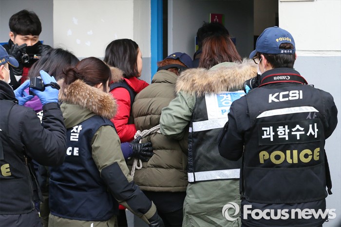 (부천=포커스뉴스) 부천 초등생 살해사건의 1차 현장검증이 실시된 21일 오전 부천 원미구 시민회관 화장실에 피의자 한 모(33)씨가 범행 상황을 재연하기 위해 들어서고 있다.