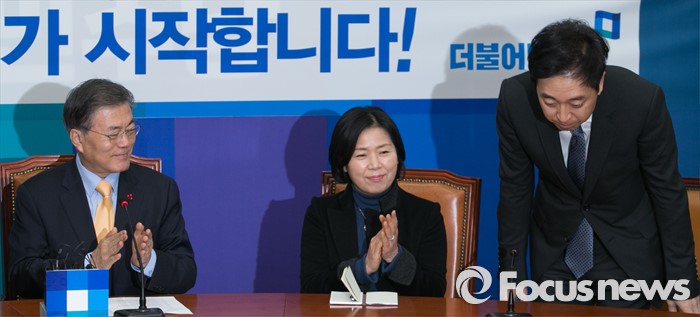 (서울=포커스뉴스) 21일 오전 서울 여의도 국회에서 열린 더불어민주당 뉴파티특별위원회 출범 회의에 참석한 금태섭 변호사가 인사하고 있다. 왼쪽부터 문재인 대표, 양향자 전 삼성전자 상무, 금 변호사.