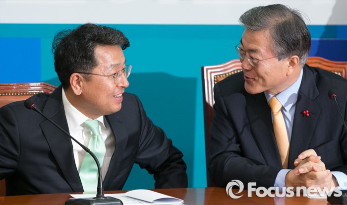 (서울=포커스뉴스) 21일 오전 서울 여의도 국회에서 열린 더불어민주당 뉴파티특별위원회 출범 회의에 참석한 문재인(오른쪽) 대표와 이철희 두문정치전략연구소장이 대화하고 있다.