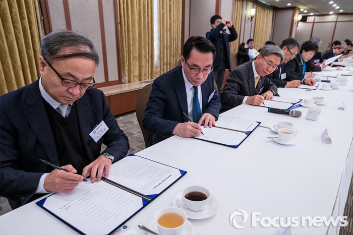 (서울=포커스뉴스) 21일 오전 서울 중구 프레스센터에서 열린 '제4회 서울 총장 포럼'에 자리한 서울 지역 대학 총장들이 국제적 경쟁력 확보 및 예산 절감, 대학의 재정적 위기상황 공동대응, 교육프로그램 공유 등이 담긴 '서울 총장 포럼 회원대학 학술교류협정서'에 서명을 하고 있다.
