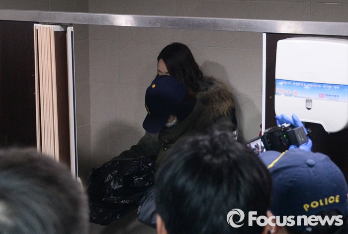 (부천=포커스뉴스) 부천 초등생 살해사건의 첫번째 현장검증이 실시된 21일 오전 부천 원미구 시민회관 화장실에서 피의자 한모 (33)씨가 범행 상황을 재연하고 있다.