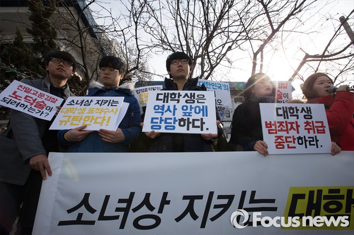 (서울=포커스뉴스) 한일 위안부 협상 폐기를 요구하며 주한일본대사관 앞 '평화의 소녀상' 인근에서 노숙 농성과 집회를 벌인 혐의로 출석요구서를 받은 대학생들이 21일 오후 서울 종로경찰서 앞에서 '소녀상을 지키는 대학생 표적수사 규탄 기자회견'을 하고 있다.