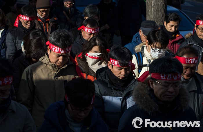 (서울=포커스뉴스) 21일 오후 서울 서초구 서울중앙지방법원 인근에서 열린 전교조 탄압 분쇄 결의대회에서 참가자들이 묵념하고 있다.