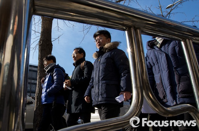 (서울=포커스뉴스) 21일 오후 서울 서초구 서울중앙지방법원 인근에서 열린 법외노조 통보처분 취소청구 고법 판결에 대한 전교조 입장 발표 기자회견을 마친 변성호(가운데) 전국교직원노동조합 위원장이 발걸음을 옮기고 있다.