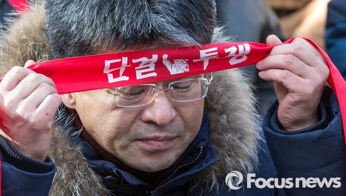 (서울=포커스뉴스) 21일 오후 서울 서초구 서울중앙지방법원 인근에서 열린 전교조 탄압 분쇄 결의대회에서 변성호 전국교직원노동조합 위원장이 머리띠를 두르고 있다.