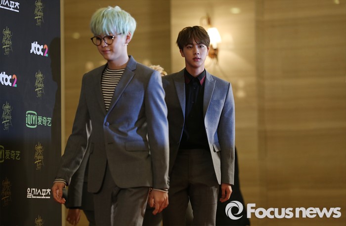 (서울=포커스뉴스) 21일 서울 동대문구 경희대학교 평화의 전당에서 열린 제 30회 골든디스크 시상식에 참석한 아이돌그룹 방탄소년단의 멤버들이 포토타임을 위해 이동하고 있다.