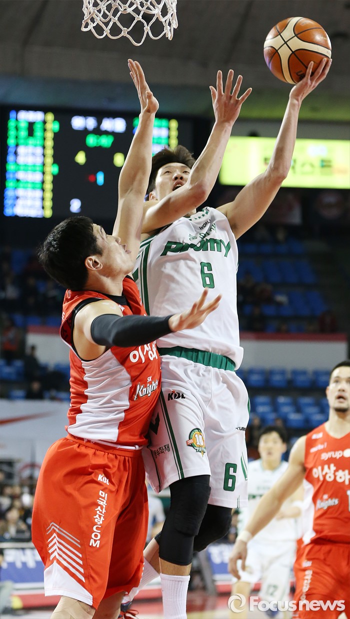 (서울=포커스뉴스) 21일 서울 잠실학생체육관에서 열린 2015-2016 프로농구 SK-동부 경기에서 동부 두경민이 SK 이정석의 수비를 뿌리치고 레이업슛을 시도하고 있다.