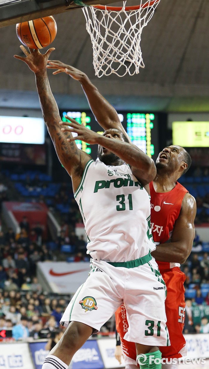 (서울=포커스뉴스) 21일 서울 잠실학생체육관에서 열린 2015-2016 프로농구 SK-동부 경기에서 동부 맥키네스의 골밑 슛때 SK 사이먼이 뒤에서 저지하고 있다.