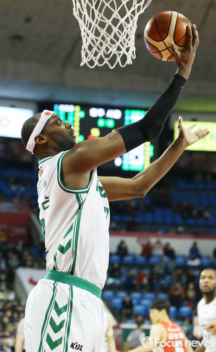 (서울=포커스뉴스) 21일 서울 잠실학생체육관에서 열린 2015-2016 프로농구 SK-동부 경기에서 동부 벤슨이 골밑에서 점프슛을 시도하고 있다.
