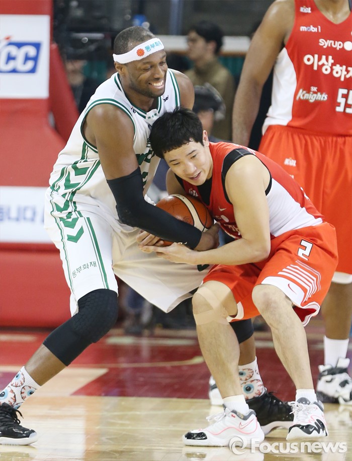 (서울=포커스뉴스) 21일 서울 잠실학생체육관에서 열린 2015-2016 프로농구 SK-동부 경기에서 SK 이정석이 동부 벤슨의 볼을 가로채려다 헬드볼이 되고 있다.