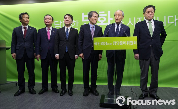 (서울=포커스뉴스) 국민의당(가칭) 창당준비위원회 공동 위원장직을 수락한 후 2주 만에 모습을 드러낸 윤여준 전 장관이 22일 오전 서울 마포구 국민의당 당사에서 기자회견을 하고 있다. (오른쪽 두번째 부터) 윤여준 전 장관, 한상진 공동창준위원장, 안철수 인재영입위원장