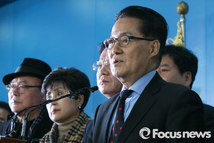 (서울=포커스뉴스) 박지원(오른쪽) 더불어민주당 의원이 22일 오전 서울 여의도 국회 정론관에서 탈당을 표명하는 기자회견을 하고 있다.