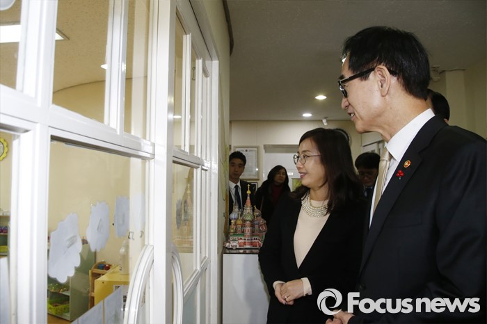 (서울=포커스뉴스) 이준식 사회부총리 겸 교육부장관이 22일 오전 서울 용산구 일민유치원을 찾아 학부모, 보육 관계자 등과 간담회를 열기 전 보육현장을 둘러보고 있다.