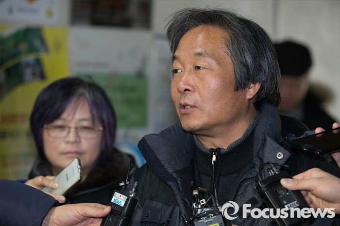 (서울=포커스뉴스) 박래군(오른쪽) 4·16연대 상임운영위원과 김혜진 운영위원이 22일 오전 서울 서초구 서울중앙지방법원에서 열린 선고 공판을 마친 뒤 취재진의 질문에 답하고 있다.
