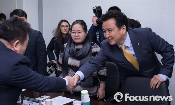 (서울=포커스뉴스) 국민의당(가칭) 김영환 의원이 22일 오후 서울 구로구 한국상용 SW협회에서 열린 SW전문기업인들과의 간담회에서 기업인들과 인사를 나누고 있다.