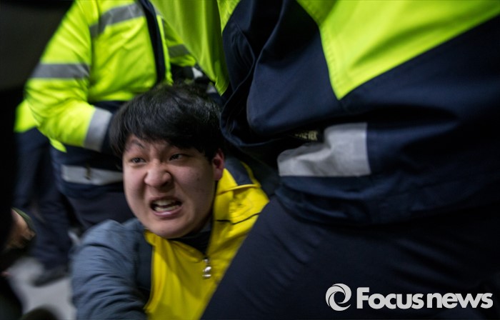 (서울=포커스뉴스) 22일 오후 서울 중구 서울고용노동청을 민원실을 점거한 알바노조원이 경찰과 충돌하고 있다. 알바노조 조합원 100여명은 근로감독관 일처리 개선을 촉구하며 노동청을 기습 점거했다.