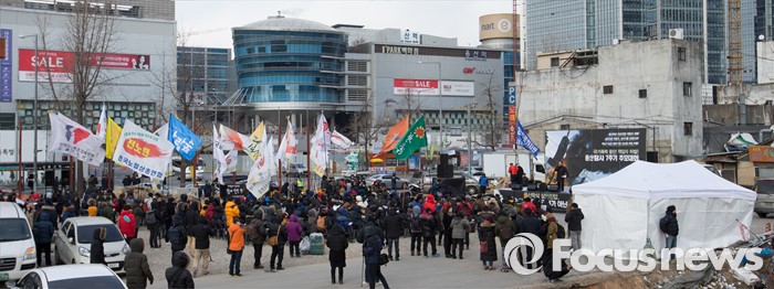 (서울=포커스뉴스) 23일 오후 서울 용산참사가 일어났던 용산4구역 재개발 지역에서 열린 '용산참사 7주기 추모대회'에 유족들을 비롯한 당시에 같이 망루에서 활동했던 생존자들이 참석하고 있다.