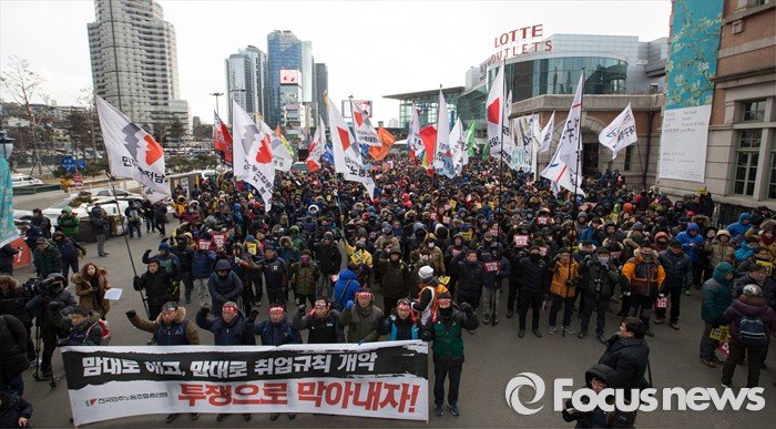 (서울=포커스뉴스) 23일 오후 서울역 광장에서 전국민주노동조합총연맹 회원들이 '민주노총 총파업 선포대회'를 하고 있다.