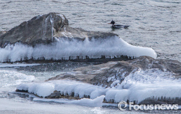 (남양주=포커스뉴스) 한파경보가 내린 23일 오후 경기도 남양주시 한강에 바다비오리가 나타났다. 대부분의 한강도 꽁꽁얼은 상태에서 물살이 센 지역만 일부 얼지 않았고, 이곳에 바다에서나 볼 수 있는 바다비오리가 나타나 유영하고 있다. 한편 24일은 올 겨울 들어 가장 혹독한 추위로 서울지방은 아침 최저기온이 영하 18도,체감온도는 영하 30도로 5년 만에 한파경보가 계속된다.