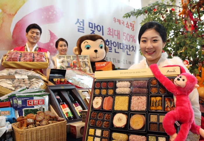 우본은 "설 명절에 소포우편물이 안전하고 정시에 배송되기 위해서는 우편물이 집중되는 2월 1일 이전 선물을 발송하고 파손 및 훼손되기 쉬운 우편물은 견고하게 포장하고 취급주의를 표시해 줄 것"을 부탁했다.(서울=포커스뉴스) 11일 오전 서울 중구 중앙우체국에서 열린 우체국쇼핑 설맞이 할인 대잔치에서 우체국직원 모델들이 우리 농수특산물을 소개하고 있다. 우체국쇼핑 설맞이 할인 대잔치는 11일부터 오는 2월 1일까지 열리며, 우리특산물을 최대 50%까지 할인 판매한다. <사진제공=우정사업본부> 2016.01.11 포커스포토