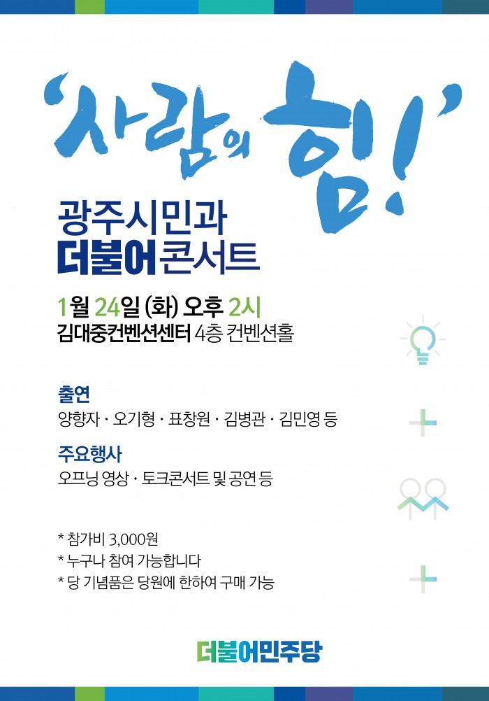 더민주는 지난 17일 국회에서 '더불어 컨퍼런스'를 개최해 뜨거운 호응을 얻었다. 이에 더민주는 광주를 시작으로 제주, 부산, 대구, 강원, 대전, 전주 등에서 '더불어 콘서트'를 이어갈 계획인 것으로 알려졌다.