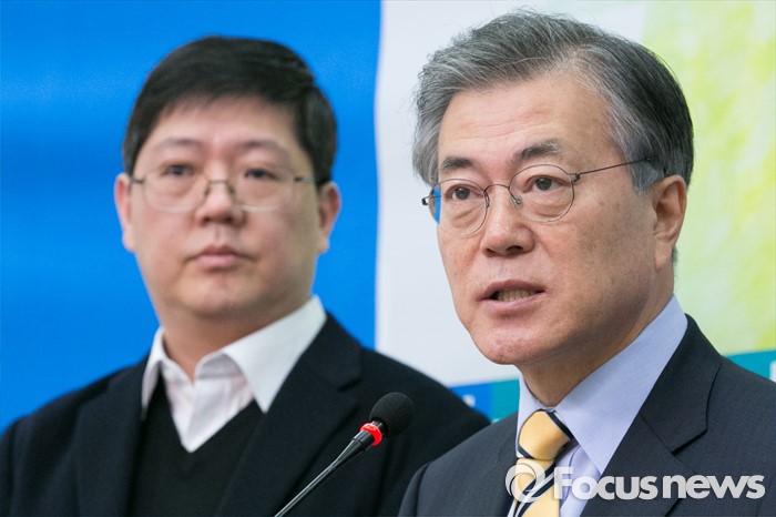 (서울=포커스뉴스) 문재인(오른쪽) 더불어민주당 대표가 24일 오전 서울 여의도 국회 대표회의실에서 김대중 전 대통령의 삼남 김홍걸(왼쪽) 연세대 김대중 도서관 객원교수의 입당에 대해 인사말을 하고 있다.