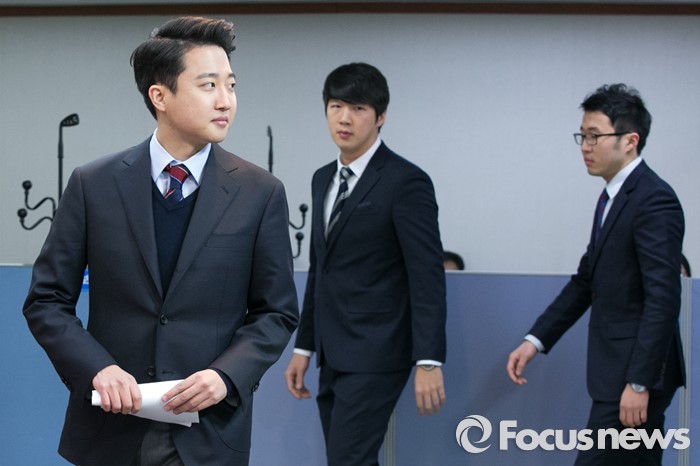 (서울=포커스뉴스) 이준석(왼쪽) 전 새누리당 비상대책위원장이 24일 오전 서울 여의도 새누리당사에서 20대 총선 출마선언 기자회견을 위해 입장하고 있다.